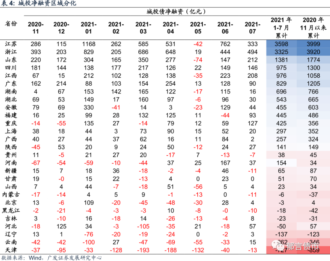 从城投区域净融资来看,依旧延续年初以来强区域净融资流入较多的趋势,江苏、浙江、山东的强区域净融资金额居前。