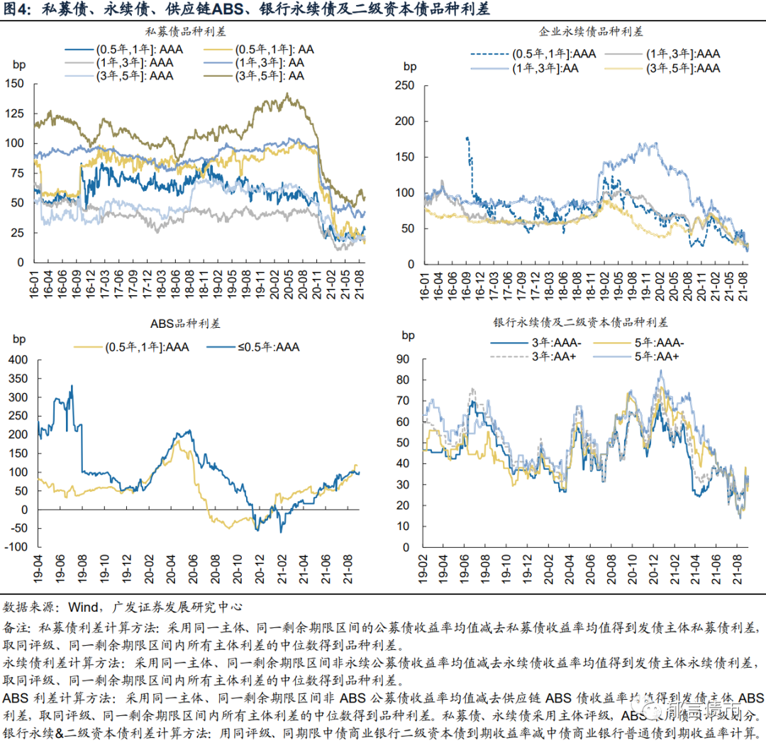 理财新规并未冲击其他品种,私募债、企业永续债品种利差整体呈现低位震荡格局。具体来看,2021年8月,各期限AAA私募债品种利差涨落互现,但幅度较小,均在5bp以内;各期限AAA企业永续债品种利差收窄2-10bp。