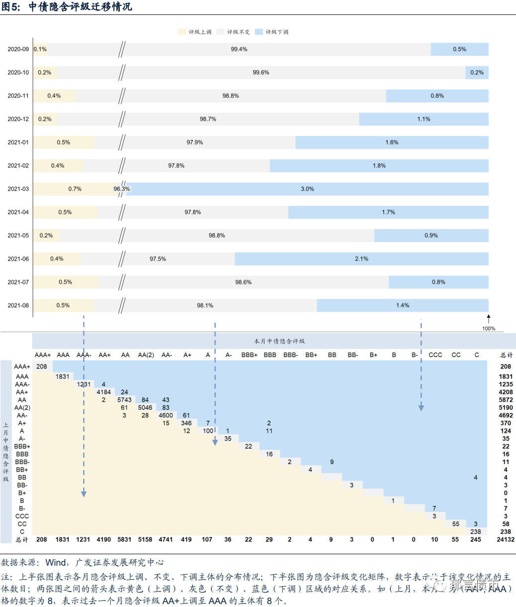隐含评级再度出现“信用分层”趋势。8月,中债隐含评级下调比例为1.4%,上调比例为0.5%,较上月下调比例上升了0.6%,上调比例维持不变。在7月隐含评级调整情况较为稳定之后,8月中债隐含评级呈现继6月后又一个“信用分层”趋势。