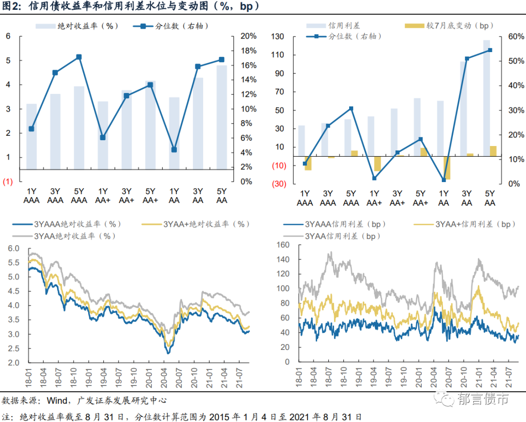 8月信用债收益率整体上行,其中5YAA是收益率上行幅度(11bp)最大的信用品种。从信用利差来看,8月信用利差分化明显。短端信用利差被动大幅压缩,1YAA、1YAA+、1YAAA利差分别压缩25bp、16bp、15bp;而中长端信用利差有所反弹,尤其是低等级信用债,5YAA、5YAA+信用利差分别走扩11bp、9bp。
