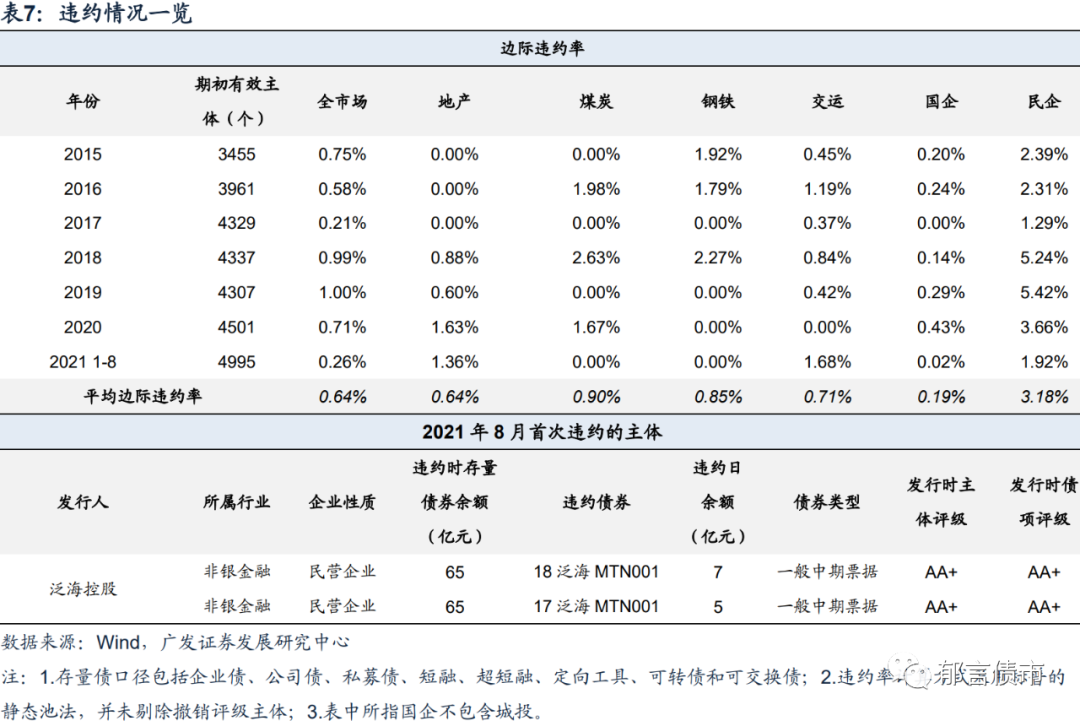 2021年8月,新增泛海控股一家违约(不含展期)主体。2021年1-8月共13家违约(不含展期)主体,以新增违约主体/期初主体数计算的边际违约率来看,2021年1-8月仅0.26%,低于2019-2020年同期水平。