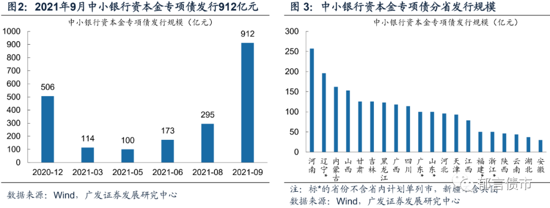 9月新增专项债发行规模高于8月,并不代表专项债发行加速,主要是由中小银行资本金专项债(应为使用2020年限额)发行较多导致。2021年9月中小银行资本金专项债发行912亿元,而8月发行295亿元。截至2021年9月末,中小银行资本金专项债已发行2100亿元,超出了2020年最初设定的2000亿元额度,其中2021年1-9月发行1594亿元。