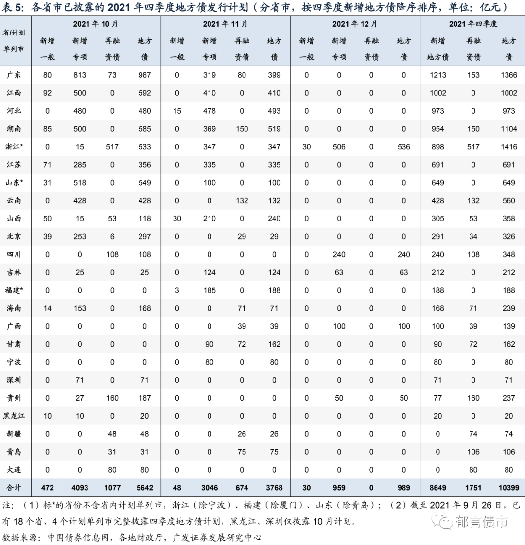 国债预测方面,假设中央赤字约90%采用国债净融资,还剩11537亿元的国债净发行未发。参考历史节奏,2019年、2020年10月净发行占四季度的比重分别为24%、25%,预计10月净发行2900亿元,对应10月总发行为7700亿元。