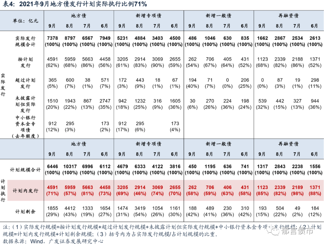 从地方债实际发行与计划对比来看,9月地方债发行计划实际执行比例明显上升。具体来看,9月计划发行的6446亿元中,按计划实际发行4591亿元,占计划发行的71%。而8月仅为57%。