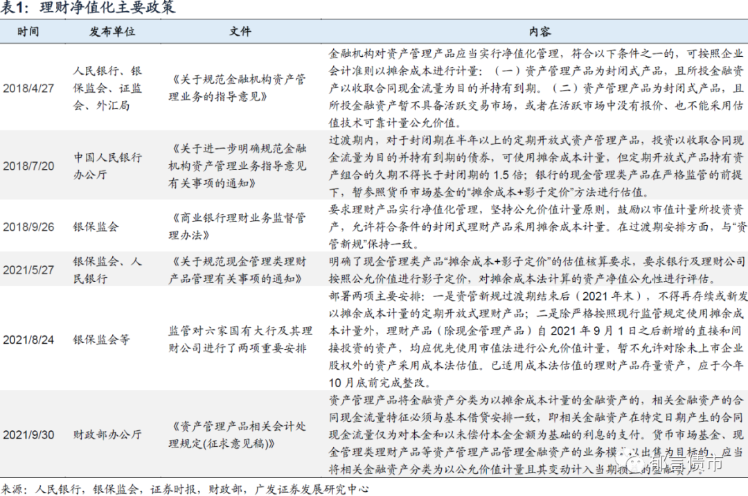 8月25日,据证券时报报道,监管对六家国有大行及其理财公司做出指导,进行两项重要安排:一是过渡期结束后(2021 年末),不得再存续或新发以摊余成本计量的定期开放式理财产品;二是除严格按照现行监管规定使用摊余成本计量外,理财产品(除现金管理产品)自2021年9月1日之后新增的直接和间接投资的资产,均应优先使用市值法进行公允价值计量,暂不允许对除未上市企业股权外的资产采用成本法估值。已适用成本法估值的理财产品存量资产,应于今年10月底前完成整改。“资管新规”过渡期进入倒计时,银行理财走向“真净值”。