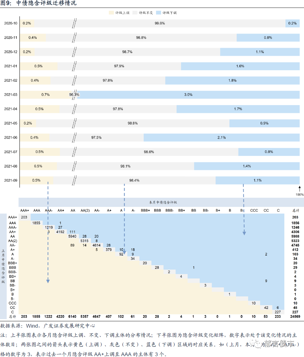 隐含评级的“信用分层”趋势有所缓解。2021年9月,中债隐含评级下调比例为1.1%,上调比例为0.5%,较上月下调比例下降了0.6%,上调比例连续三个月维持不变。在8月隐含评级调整情况呈现“信用分层”趋势后,9月中债隐含评级分层趋势有所缓解。