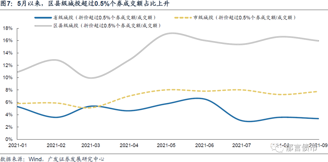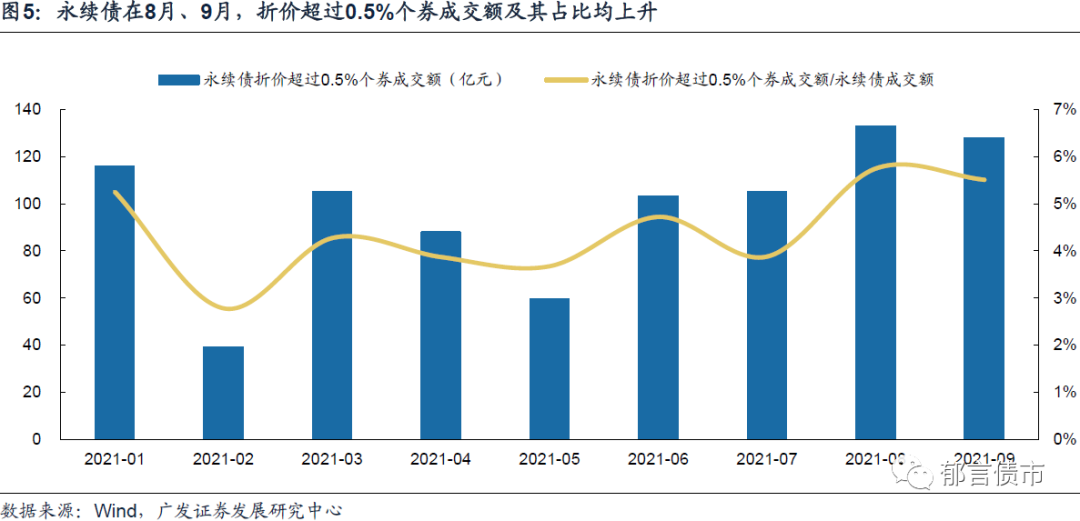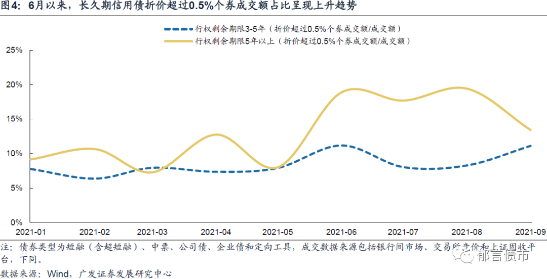 从二级市场成交看,理财产品“真净值”利空长久期信用债、永续债品种以及弱资质债券,上述债券折价成交比例上升。我们通过观察2021年以来信用债折价成交情况,判断理财产品“真净值”对信用债市场的影响。折价成交是市场情绪较弱的体现,也会带动债券估值上行。首先,计算每只成交个券的折价比率,并剔除前一交易日和交易日的面值存在差异的个券,折价比率=(加权成交净价-前一交易日估值净价)/前一交易日估值净价。其次,分期限、评级、城投行政级别计算折价比率低于-0.5%(即折价超过0.5%)的个券成交额及其占比。