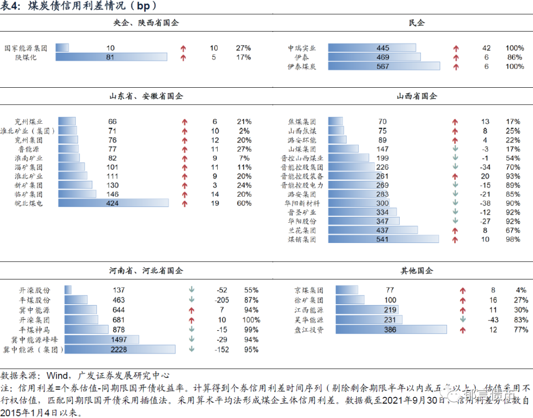 2021年9月,41家煤炭行业发债主体信用利差有27家走扩,14家收窄。利差走扩的主体中,中瑞实业走扩幅度较大,利差上升42bp,其他主体利差走扩幅度均在20bp以内。利差收窄的主要为山西、河南和河北煤企,平煤股份和冀中能源(集团)收窄幅度较大,较9月初分别下降205bp、152bp。