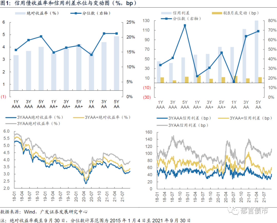 9月信用债收益率整体上行,其中1YAA+为收益率上行幅度(19bp)最大信用品种。从信用利差来看,9月信用利差全线走扩,3Y信用利差走扩幅度相对较小,3YAAA、3YAA+、3YAA利差分别走扩6bp、9bp、10bp;其他品种信用利差走扩幅度均在10bp以上。目前所有品种利差分位数均维持在20%之上,5YAAA、3YAA、5YAA利差分位数均在60%之上。