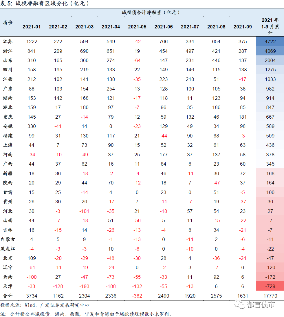 从城投区域净融资来看,2021年9月,依旧延续年初以来强区域净融资流入较多的趋势,江苏、浙江净融资金额居前。尾部区域中,贵州、山西、吉林净融资为负。