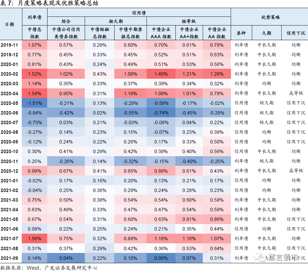 回顾9月,债市收益率整体下行,利率债表现略强于信用债。反映利率债表现的中债总指数收益率0.14%,高于信用类债券总指数0.04%。信用债中,9月短融总指数0.22%,中票总指数0.10%,显示久期选择上,短久期策略占优;AAA企业债、AA+企业债、AA企业债总指数分别为0.00%、0.07%、0.31%,显示信用下沉为优胜策略。