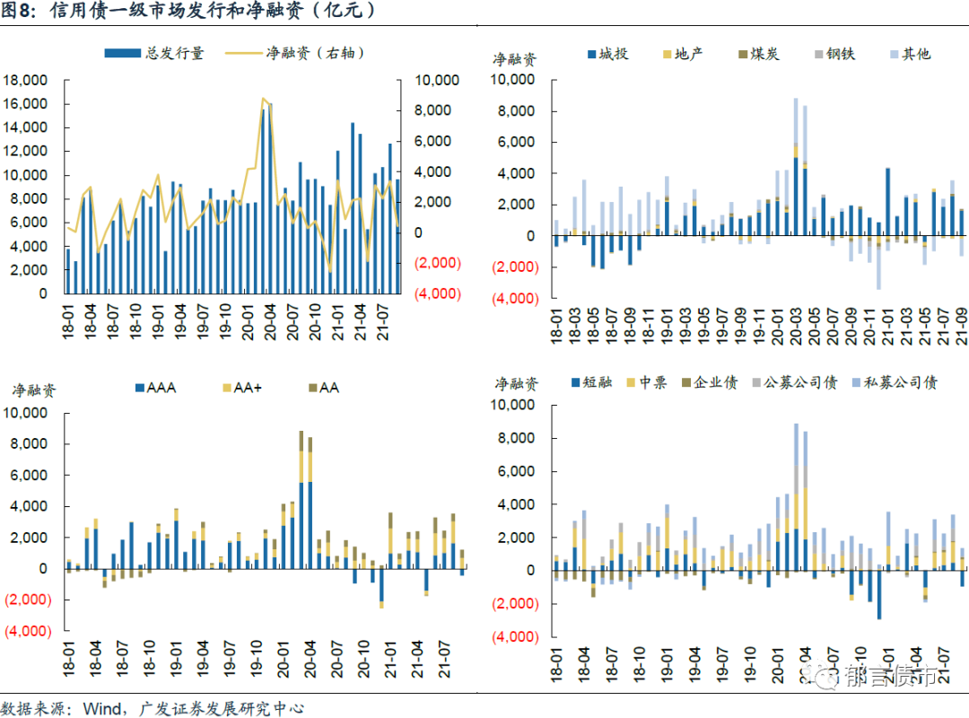 9月信用债一级发行和净融资额大幅收缩。9月信用债总发行9657.2亿元,到期9219.3亿元,净融资437.9亿元,环比减少2959.0亿元。