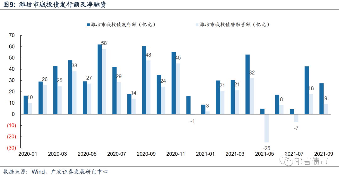 恳谈会之后效果到底如何?由于距今的时间较短,对当地城投债发行和信用利差的影响有待观察。从兰州和潍坊城投债利差走势看,2021年6月以来,二者均呈现较快的走扩趋势。信用利差走扩,将导致一级发行难度进一步上升。截至2021年10月15日,兰州公募城投债信用利差为284bp,潍坊为369bp。