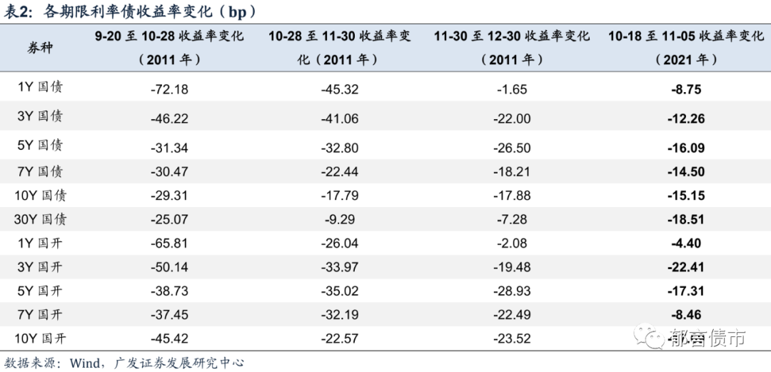 第二,从时间窗口的角度来说,2011年是11月30日重启降准,对于当下12月和1月,可能是货币政策重新宽松的窗口期,年初宽松对于刺激经济的效果更好。如果降息预期兑现,长端利率的下行可能逐步钝化。进入2022年2月之后,宽信用的预期可能会占上风,利率或重回震荡甚至小幅上行阶段。
