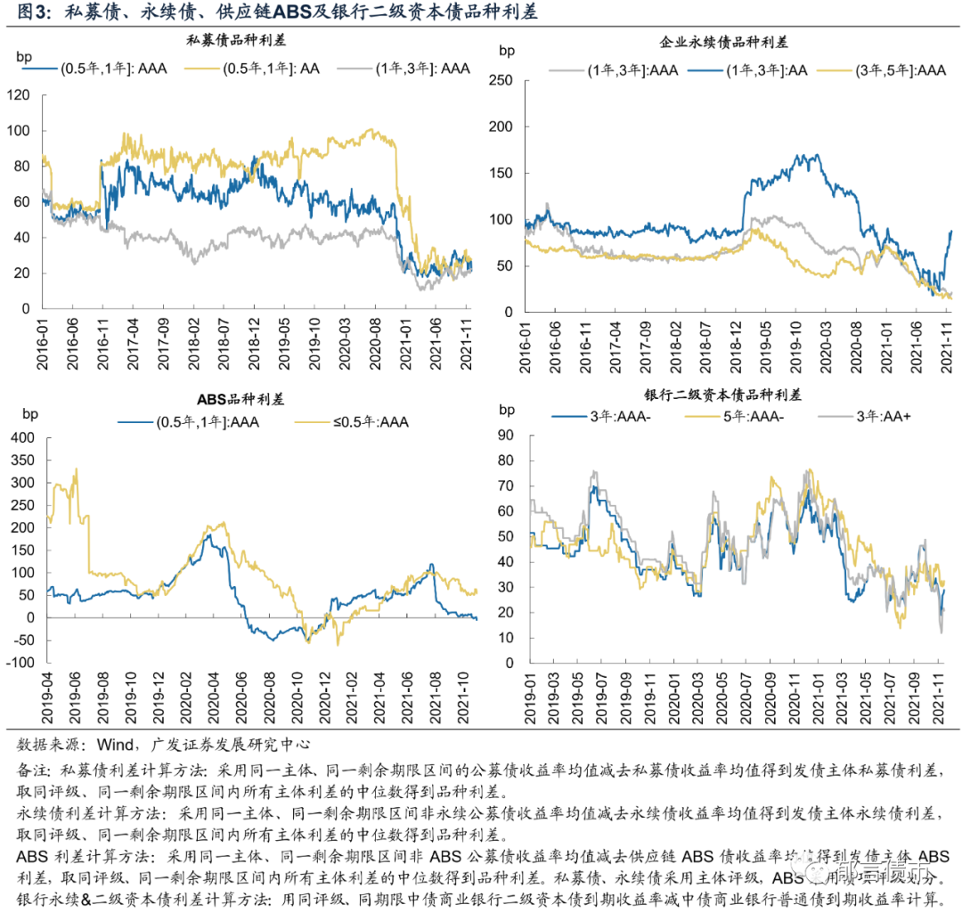 分行业看,受阳光城美元债交换要约和购房尾款ABS展期、佳兆业理财产品展期等负面影响,民营地产债出现暴跌,直至11月中旬地产融资边际放松信号的释放才有所企稳。城投信用利差普遍走扩,煤企利差走势分化。分品种看,银行二级资本债仍然是机构配置的热门品种,二级资本债利差压缩至20bp左右,高等级企业永续债利差也继续收窄,而私募债利差涨跌互现。