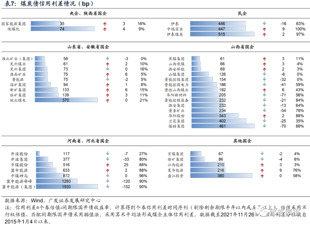 2021年11月,40家煤炭行业发债主体中20家主体利差收窄,20家主体信用利差均走扩。利差收窄幅度较大的主体集中在河北和山西省,冀中能源峰峰和冀中能源集团利差较10月分别下降120bp、152bp,华阳新材料、煤销集团和晋圣矿业利差压缩50bp以上。目前,淮北矿业集团、山煤集团和晋能控股集团利差均处于2015年以来的最低位。