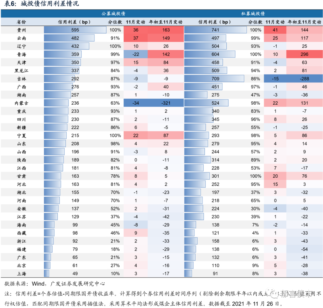 城投主体利差普遍走扩。2021年11月,共9个省城投公募债信用利差收窄。其他省份城投利差均呈现不同程度走扩。其中,内蒙古、青海城投利差较上月压缩20bp以上,而贵州、云南、宁夏走扩幅度大于20bp。