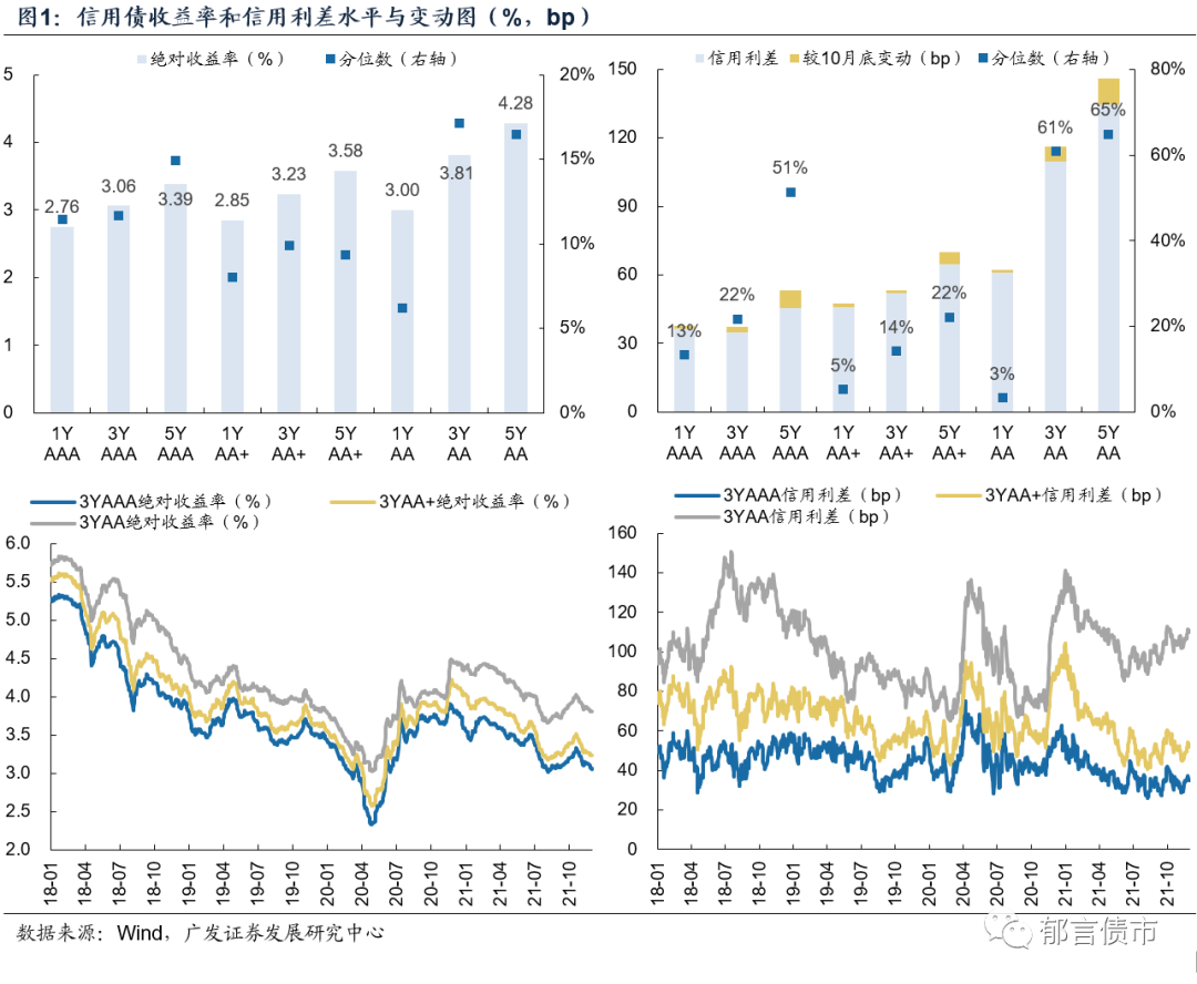 11月信用债一级市场持续回暖,二级市场收益率下行、利差被动走扩。一级市场方面,信用债净融资大幅增加,城投债净融资也大幅回升,地产债净融资额由负转正。二级市场方面,信用债收益率整体下行,3Y收益率下行幅度最大,但由于利率债下行幅度更大,信用债利差被动走扩。