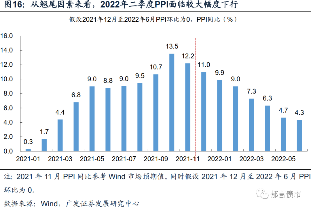 2022年二季度,重要线索是PPI回落,GDP同比面临较高基数,长端利率可能出现短暂机会。2021年1-5月、8-10月PPI环比各月的增幅在0.7个百分点之上。这使得2022年1-5月PPI同比翘尾因素面临快速下行,进入2022年二季度,翘尾因素可能回落到5%以内。同时,2021年一至三季度GDP环比季调增速分别为0.2%、1.2%和0.2%,这意味着2022年二季度GDP同比面临较高基数,GDP同比增速有可能出现放缓。如二季度PPI同比、GDP同比增速两者均较一季度有所放缓,两相叠加,可能使得货币宽松预期再度升温,利率出现阶段交易机会。受经济实际增速和价格双回落影响,长端利率可能经历短暂下行。