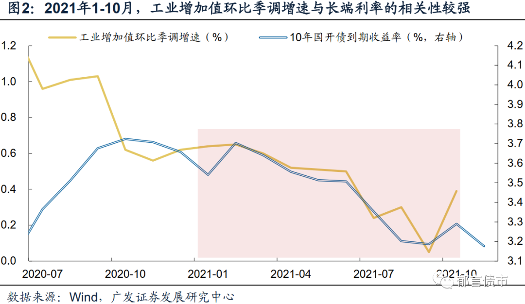 经济环比指标与长端利率走势呈现一定程度的相关性。观察工业增加值环比季调增速,与10年期国开债到期收益率走势,可以发现,两者在2021年1-10月呈正相关。在工业增加值环比季调增速呈趋势放缓过程中,长端利率相应下行。与PPI的弱相关性形成对照,工业增加值环比季调增速与长端利率的相关性,反映出市场相对更关注经济的实际增长率而不是价格、以及更关注环比增速而非同比增速。