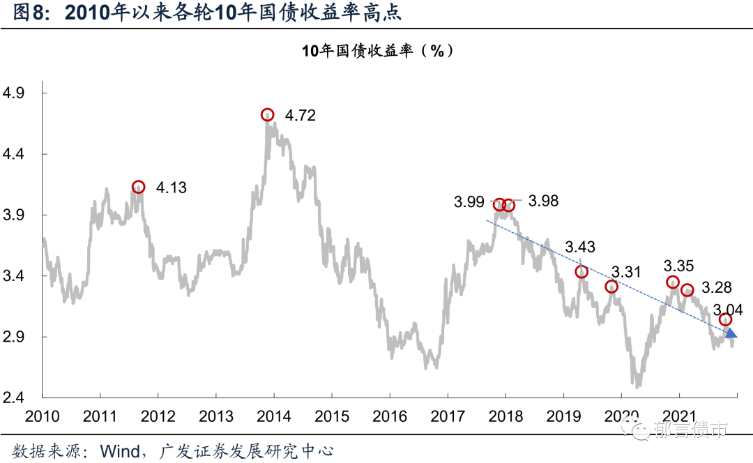 参考2020下半年至2021年,近三轮调整的高点分别为3.35%、3.28%、3.04%,中枢则位于1年期MLF利率2.95%附近,预计2022年的10年国债收益率可能不会持续停留在3.0%以上。