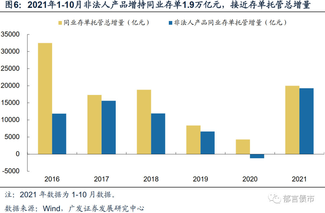 伴随非银行业金融机构存款的增加,有两方面的变化值得关注:一是银行同业存单净融资规模较大,且非法人产品大量增持存单。2021年1-10月上清所同业存单托管量增加2.0万亿元,规模大于2017-2020各年全年增量;其中非法人产品增持1.9万亿元,规模大于2016-2020非法人产品各年全年增持量。非法人产品主要指证券投资基金、保险产品、证券公司资产管理计划和银行理财产品等,主要是非银金融机构所成立的金融产品。因而非法人产品大量增持同业存单,指向非银金融机构向银行输送资金。