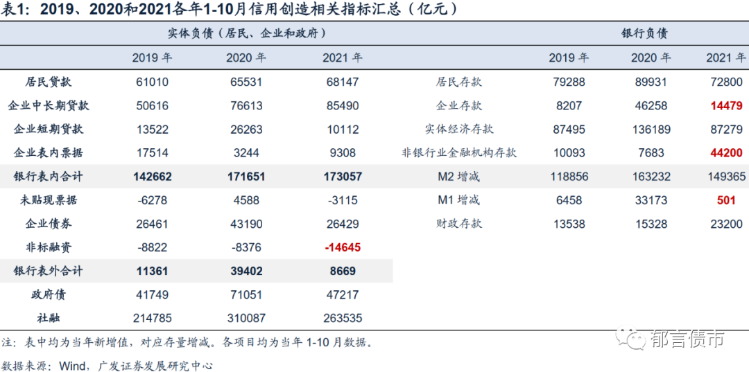 从资产负债角度进行分析,实体经济负债方面,2021年1-10月居民和企业部门银行表内融资合计增17.3万亿元,略高于2020年同期,明显高于2019年同期;但居民和企业部门银行表外融资合计仅8669亿元,低于2019、2020年同期。政府债融资方面,2021年1-10月也明显低于2020年同期。对实体部门而言,一方面是表内融资维持,而表外融资压缩,尤其是非标融资压缩明显;另一方面是政府部门融资压缩。
