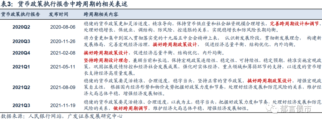 如何理解跨周期调节?从跨周期调节表述的演进来看,2020年7月30日政治局会议首次提到“完善宏观调控跨周期设计和调节,实现稳增长和防风险长期均衡”。其后央行货币政策执行报告中频繁提到跨周期的相关表述。2020年二季度货币政策执行报告(2020年8月6日发布)中开始提及“跨周期”字眼,至2021年二季度货币政策执行报告(2021年8月9日发布),提及“跨周期设计”、“跨周期理念”,处于设计阶段;2021年三季度货币政策执行报告(2021年11月19日发布)中表述为“做好跨周期调节”,指向跨周期货币政策框架可能基本设计完善,进入落地阶段。