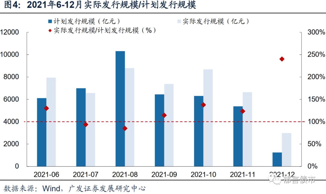 从地方债实际与计划发行对比来看,2021年6-11月实际发行规模/计划发行规模在85%-138%之间。2021年12月1-24日实际发行规模/计划发行规模为240%。12月实际发行规模超过计划1746亿元,主要是由于12月15日北京发行了1721亿元定向再融资债,用途为偿还存量债务,而在计划中未披露。