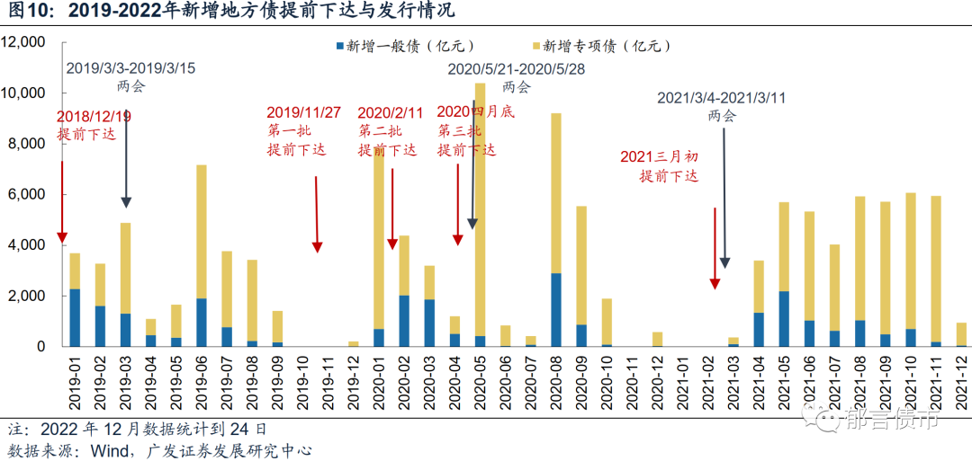 预计2022年提前下达额度将在一季度基本发完。回顾历史数据,2019、2020年提前额度下达后,在3个月内基本发完,且在提前额度下达后的1-2个月达到发行高点。2021年3月初提前下达,在8月才发完,经历了约6个月,主要是由于2021年专项债监管严格,8月之前新增专项债发行较慢。考虑到2021年12月16日“加强和完善地方政府债务管理情况国务院政策例行吹风会” 强调,“提前下达额度尽快形成实物工作量”、“将持续加强督导,推动提前下达额度在明年一季度发行使用,为稳定宏观经济大盘提供有力支撑”。预计2022年提前下达专项债限额,更接近2019年、2020年提前批发行情况,在限额下达后的3个月内基本发行完毕。