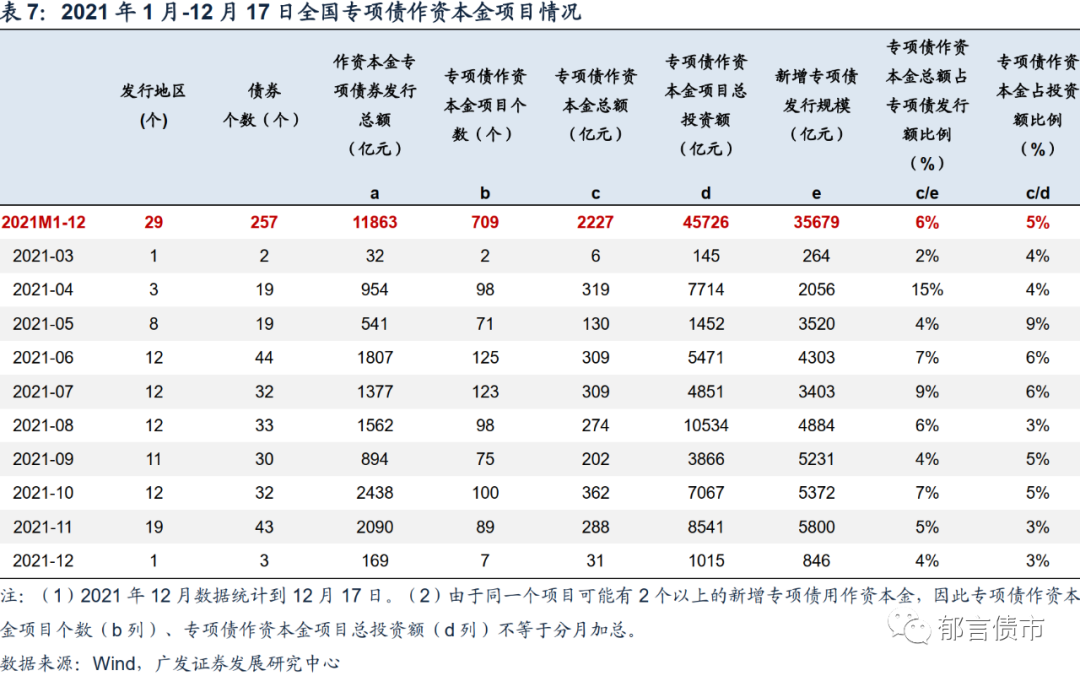 2021年1月-12月17日,专项债作资本金总额占专项债发行额比例约为6%。全国共落地作资本金的专项债券257只,合计金额2227亿元。从项目层面来看,1月-12月17日专项债作资本金的项目709个,涉及项目的总投资额达45726亿元。