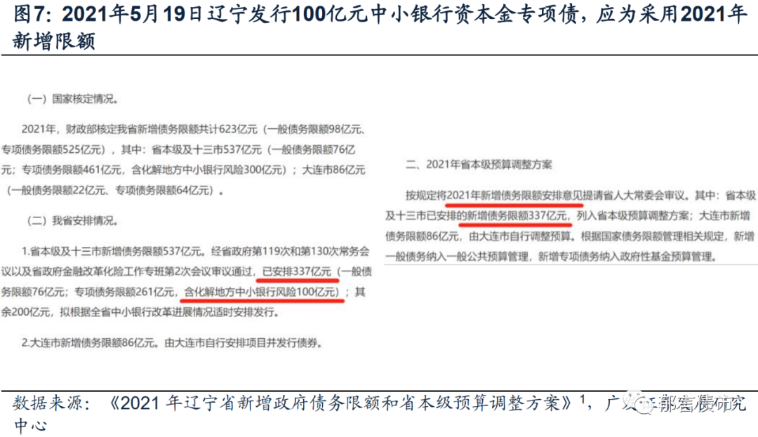 从实际发行来看,2021年1月-12月24日发行1594亿元中小银行资本金专项债,超过2020年剩余额度1494亿元。我们倾向于认为,辽宁2021年5月发行的100亿元应为采用了2021年新增债务额度。有两点验证。第一,《2021年辽宁省新增政府债务限额和省本级预算调整方案》提到,已安排的2021年新增债务限额337亿元,包括中小银行资本金专项债100亿元。第二,扣除辽宁100亿元后,与财政部官方数据一致。2021年8月24日,在《7月地方政府债券发行和债务余额情况》中,财政部提到“截至2021年7月末,2020年已下达用于中小银行风险化解的2000亿元专项债券额度已发行793亿元。”扣除辽宁后,截至2021年7月末,中小银行资本金专项债发行793亿元。