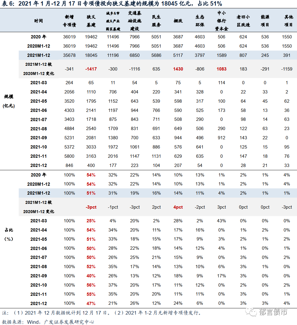 从投向占比变化来看,2021年1月-12月17日,投向狭义基建的占比较去年同期下滑3个百分点,投向棚改的占比较去年同期上升4个百分点。投向中小银行资本金的占比较去年同期上升3个百分点,投向民生服务的占比较去年同期上升2个百分点,投向老旧小区改造的占比较去年同期上升0.5个百分点。