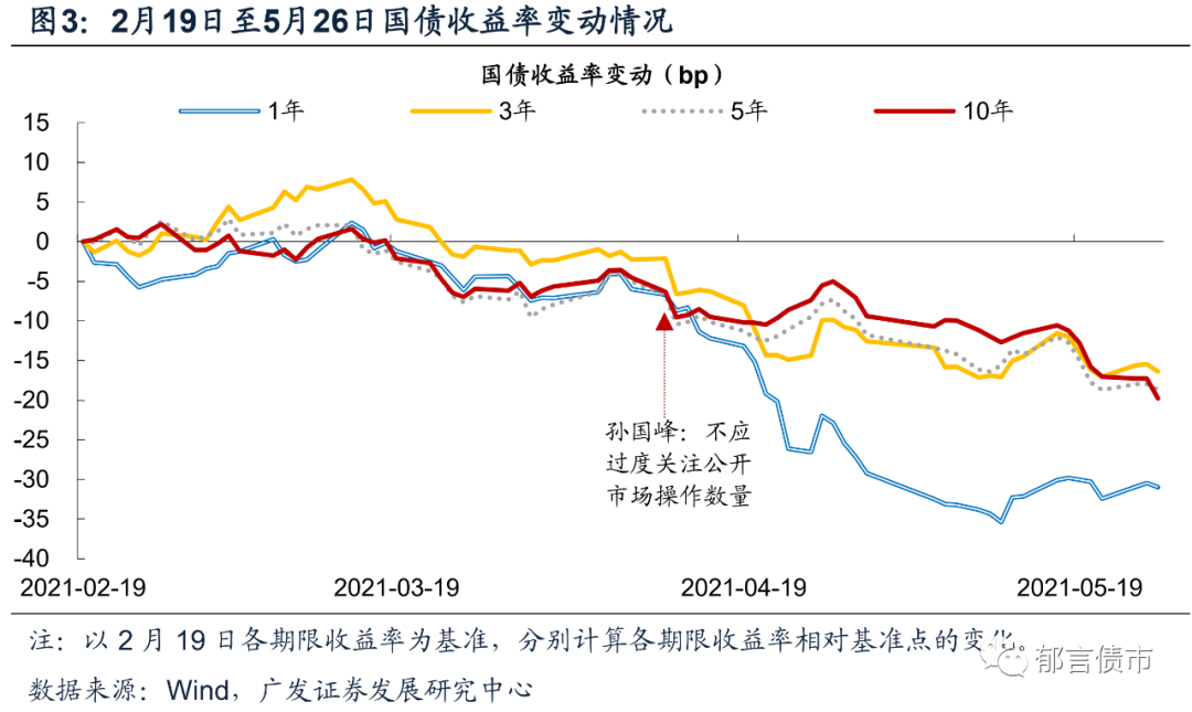 在此期间,也没有等来地方债的发行高峰。3-5月地方新增债发行量分别为364、3399、5701亿元,并未出现类似2020年5月的地方新增债1万亿以上的发行高峰(10398亿元),市场陷入资产荒(2021年4月5日的报告《“资产慌”与“资产荒”》)。4月12日,一季度金融统计数据新闻发布会上,货币政策司司长孙国峰提到“为政府债券发行提供适宜的流动性环境”,也使得市场对地方债供给的担忧得到缓解。