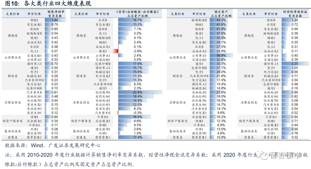 (1)周期类:包括煤炭、钢铁、有色金属、石油石化、化工、水泥、玻璃等行业,其特点在于产成品往往属于“标准品”,同时资产偏重每年有大额折旧摊销需要计提,叠加行业强周期性,带来较高的盈利波动性。