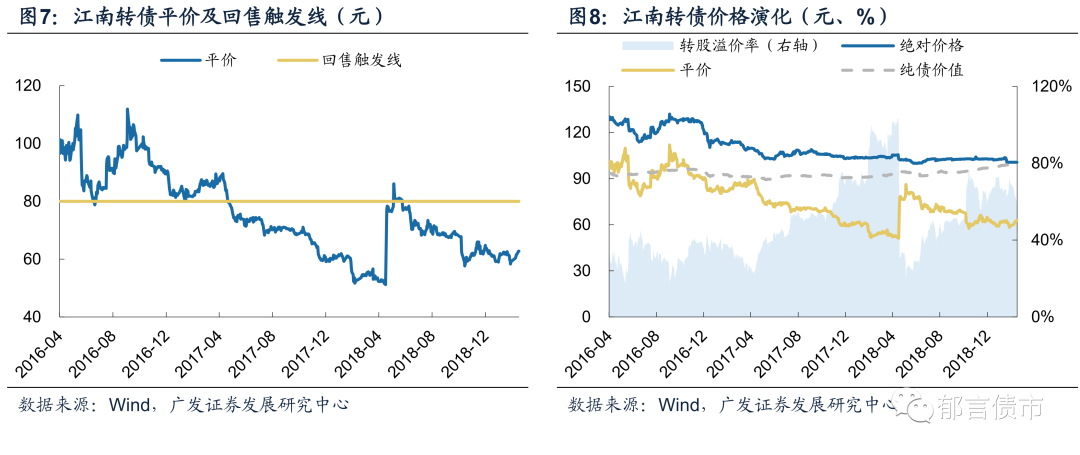 此外,江南转债回售条款设置较为宽松,是其多次触发回售的另一重要原因。江南转债规定:回售期内,如果正股股价在任意连续30个交易日内低于转股价的80%(通常为70%),持有人有权将转债回售给公司。