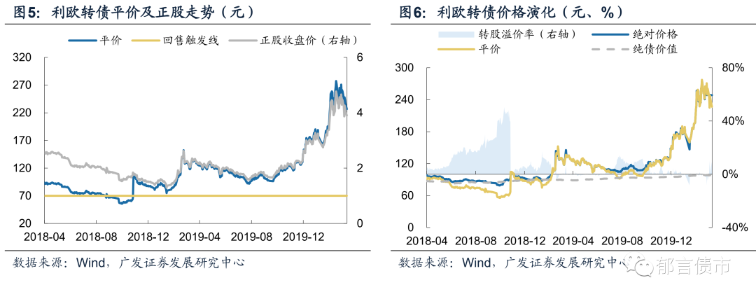 根据《深圳证券交易所股票上市规则(2018年11月修订)》,“在本所仅发行 A 股股票的上市公司,通过本所交易系统连续二十个交易日(不含公司股票全天停牌的交易日)的每日股票收盘价均低于股票面值,本所有权决定终止其股票上市交易。”此外根据该规则,一旦正股被终止上市,转债也将一并被终止上市。所幸2019年以来利欧股份扭转股价持续下滑趋势,避免了被强制退市,随后转债也通过转股顺利退出,但这也提醒投资者如果正股股价低迷且接近面值,需关注面值退市风险。