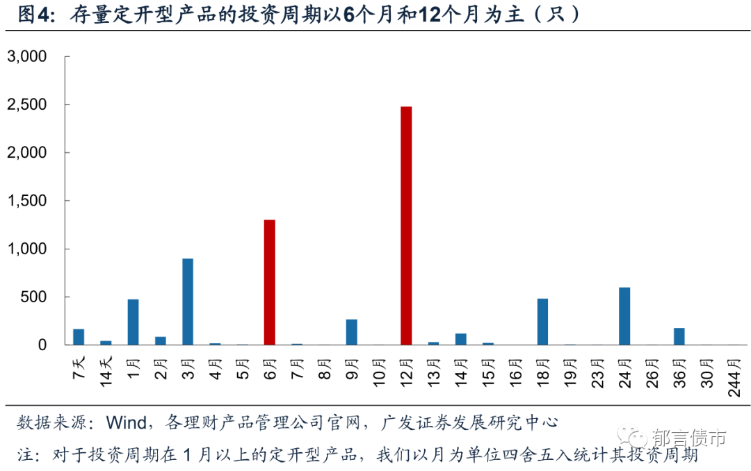 定开型产品的投资周期以6个月和12个月为主,两类产品数量分别为1303、2479只,分别占比18.1%、34.5%。我们统计了定开型产品的下次开放时间,除去缺失值外共有7182只产品纳入统计,其中80.0%定开型产品的投资周期在一年以内。