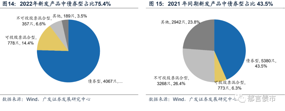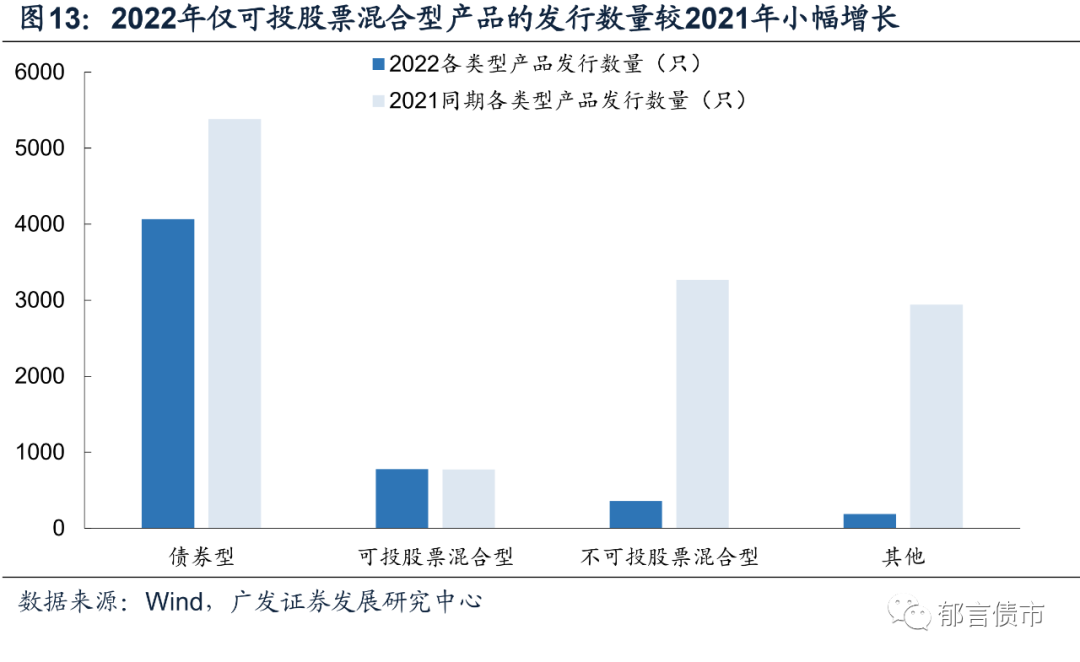 截至2022年3月13日,2022年新发行产品中不可投股票混合型产品数量下滑幅度最大,同比减少89.1%,数量对应减少2911只。此外,债券型产品同比减少24.4%,数量对应减少1313只,可投股票混合型产品同比增长0.6%,数量增加5只。