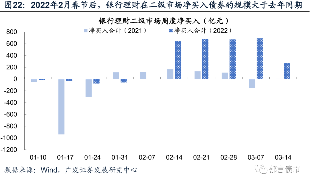 我们统计了银行理财在债券二级市场的净买卖规模。2月春节后以来,银行理财每周净买入债券的规模达到600亿元左右,明显高于2021年同期,说明银行理财投向债券市场的资金可能在增加,并没有被动卖出。