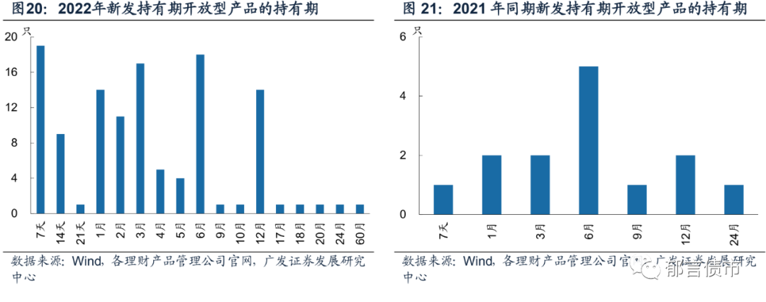 2022年新发持有期开放型产品数量较2021年同期增长750.0%,且持有期集中在6个月以内,7天占比最多,达16.0%。此外,6个月、3个月、12个月持有期的产品数量分别为18、17、14只,占比分别为15.1%、14.3%、11.8%。