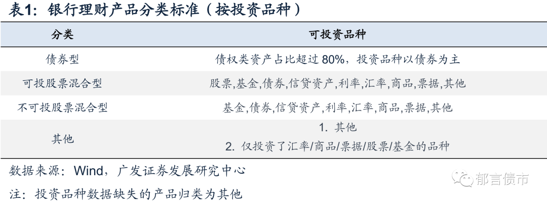 我们根据银行理财产品的投资品种将其分为债券型、可投股票混合型、不可投股票混合型、其他四种产品类型。其中,债券型产品指债权类资产的投资比例超过80%,以投资债券为主。对于投资比例无法划分的产品,我们按照投资品种是否包含股票进行分类,其中可投股票混合型产品的投资品种数量在2种及以上且包含股票,不可投股票混合型产品的投资品种数量在2种及以上且不包含股票,其他类型产品的投资品种为其他,或仅包含汇率/商品/票据/股票/基金中的其中一种。