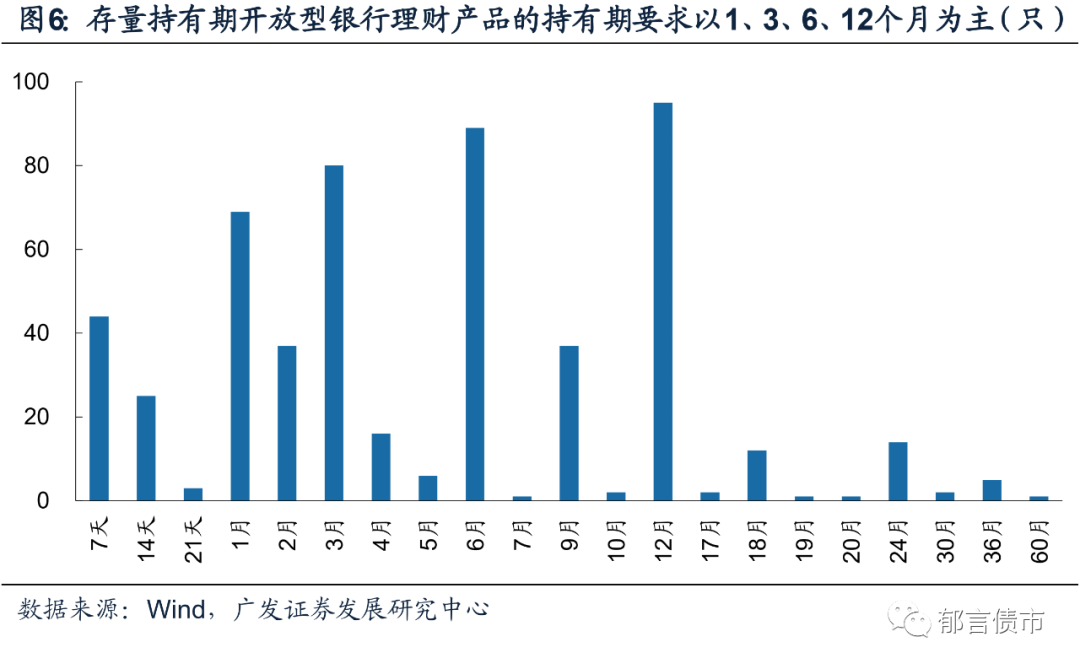 92.9%持有期开放型产品的持有期要求在一年以内,并以12个月居多,占比17.5%。此外,6个月、3个月、1个月持有期开放型产品的占比也比较高,分别为16.4%、14.8%、12.7%。