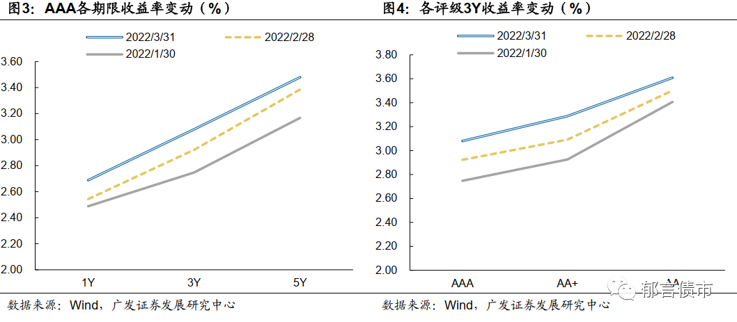 从走势看,2022年以来,信用债收益率跟随利率债,经历了1月的下行和2、3月的上行。2022年1月,央行降息、流动性转松,利率向下突破。2月,由于1月社融数据超预期,叠加原油等大宗商品价格上涨、美联储加息预期上升、以及部分城市放松限购,利率转而向上。3月,大宗商品价格上涨,带动通胀预期升温,以及2月制造业PMI超预期等因素影响下,货币宽松预期明显降温,中短端利率上行。