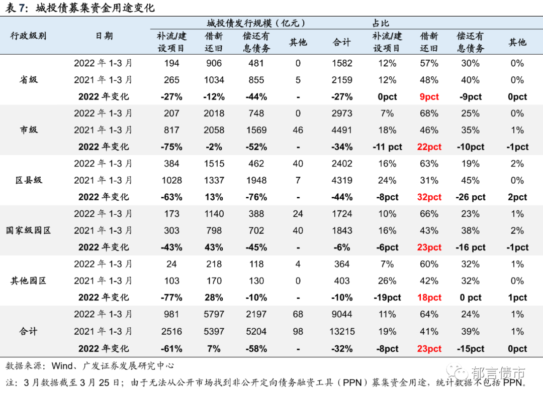 从城投债发行结构看,一是私募债占比下降,私募债占比为36%,明显低于2021年同期的42%;二是主体评级AA城投发债占比有所下降;三是区县级城投发债占比下降,而国家级园区城投发债占比上升;四是城投发债呈现短期化趋势,1年以内、1-3年的占比均高于去年同期。从募集用途看,借新还旧占比明显上升。