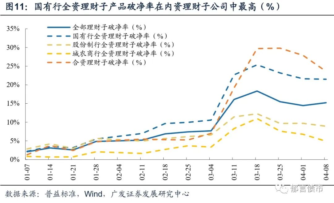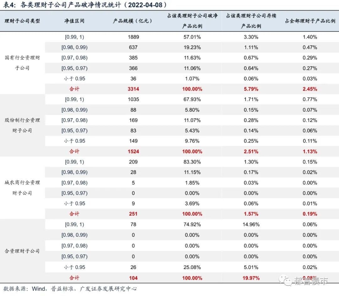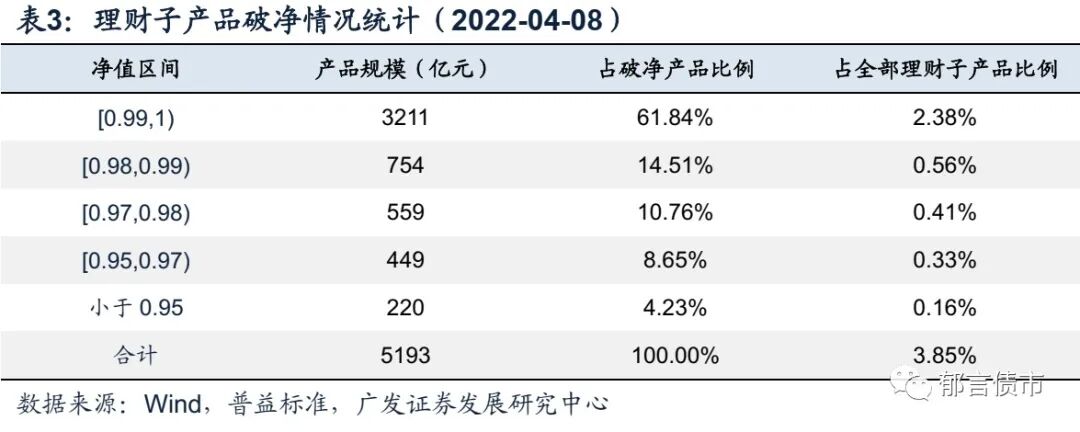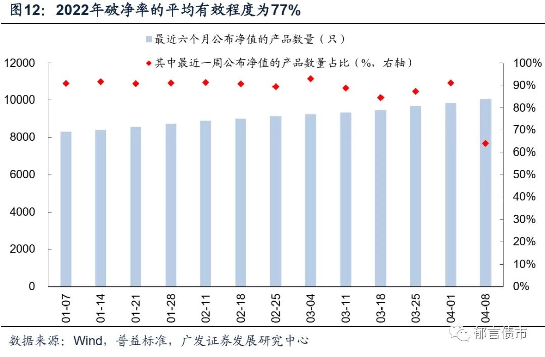 需要说明的是,我们在统计破净率数据时,均采用过去一周披露过净值数据的理财产品作为分母,并将其中净值小于1的产品数目作为分子;对于4月1日和4月8日的数据,由于过去一周披露过净值数据的理财产品占比较低,我们对过去两周披露过净值数据的理财产品进行统计。