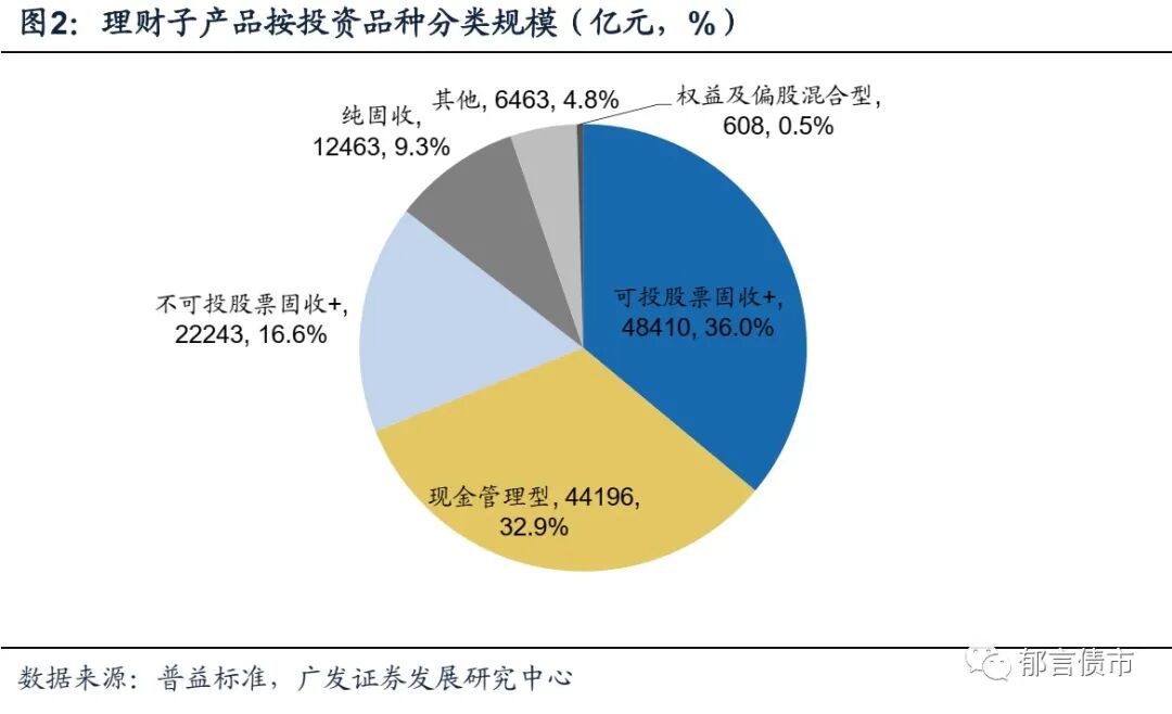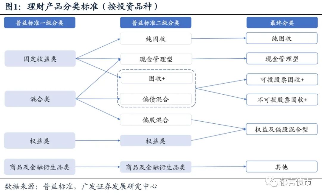我们参考普益标准二级分类,最终将理财产品分为六类。具体来看,我们根据是否可投资股票,将偏债混合和固收+产品分类为可投股票固收+和不可投股票固收+产品,将偏股混合产品和权益类产品归类为权益及偏股混合型产品,将商品及金融衍生品类和未进一步分类的固收类及混合类产品归为其他。