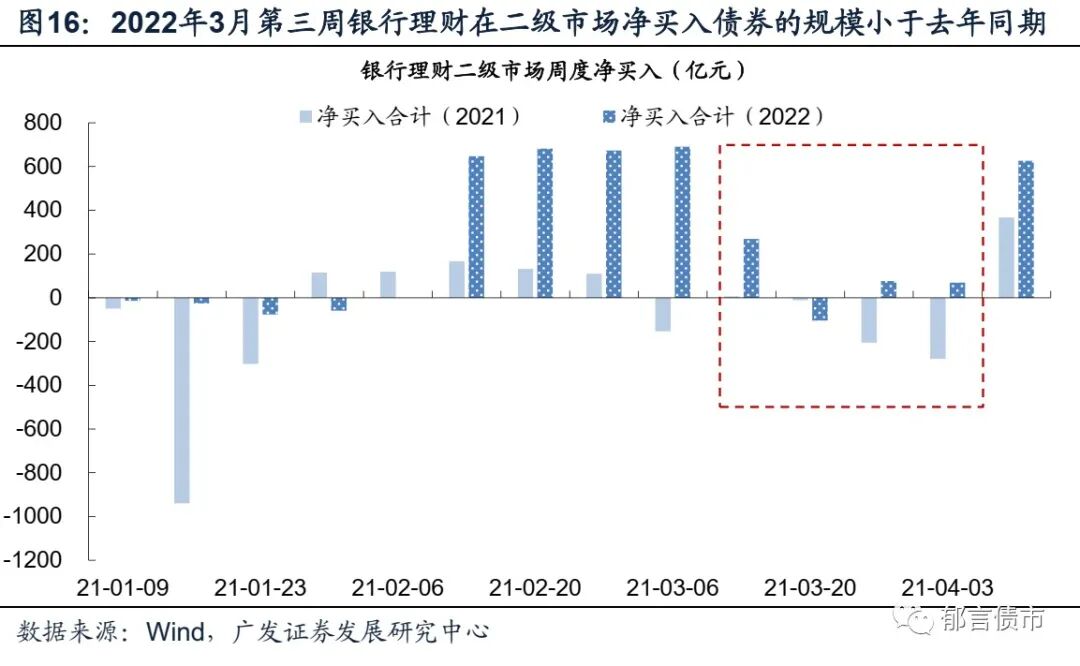 我们统计了银行理财在债券二级市场的净买卖规模。2月份银行理财每周净买入债券的规模达到600亿元以上,明显高于2021年同期,一定程度说明银行理财受居民赎回的影响较小,更多是主动止损赎回基金产品,资金回流债市。3月份以来,银行理财平均每周净买入债券的规模为188亿元,较之前所下降,可能说明银行理财主动止损赎回基金的行为有所缓和。