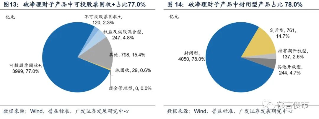 从产品的投资品种来看,破净理财子产品以可投股票固收+为主,为3999亿元,占比77.0%。此外,权益及偏股混合型、不可投股票固收+、纯固收产品的占比分别为4.8%、2.3%、0.6%。