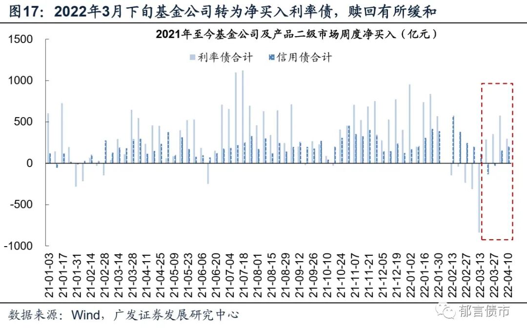 与此同时,我们发现在2月春节后至3月中旬,与银行理财的净买入相反,基金公司一直在二级市场净卖出利率债,并且卖出规模逐周增加,可能与相关固收+产品被银行理财产品主动赎回有关。不过3月下旬以转为净买入利率债,规模呈上升趋势,可能同样意味着近期基金被赎回有所缓和。